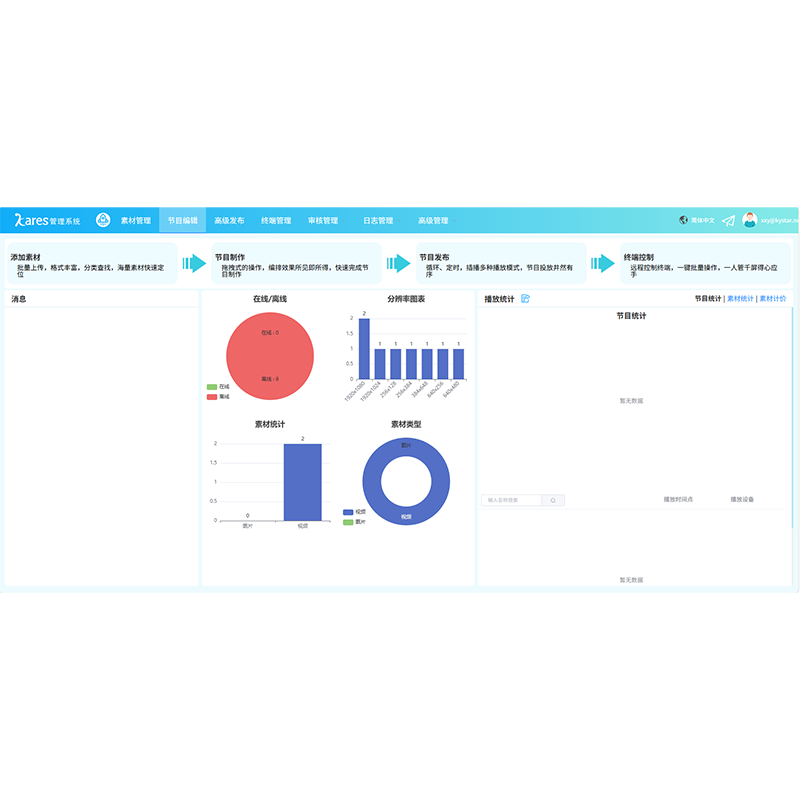 Support remote publishing control over WAN, LAN, and 4G/5G networks Real-time monitoring of terminal operation status and acquisition of playback screen One-click batch operations such as setting volume, adjusting brightness, turning on and off the screen, restarting, and whether to play programs Flexible authorization for multiple users Organizations can implement hierarchical and multi-level management of users, terminals, materials, playlists, etc. Support drag-and-drop program scheduling Support multiple playback modes such as loop, timing, immediate insertion, and timing insertion Support breakpoint resumption Support all-media integrated publishing Support remote screen lock and unlock