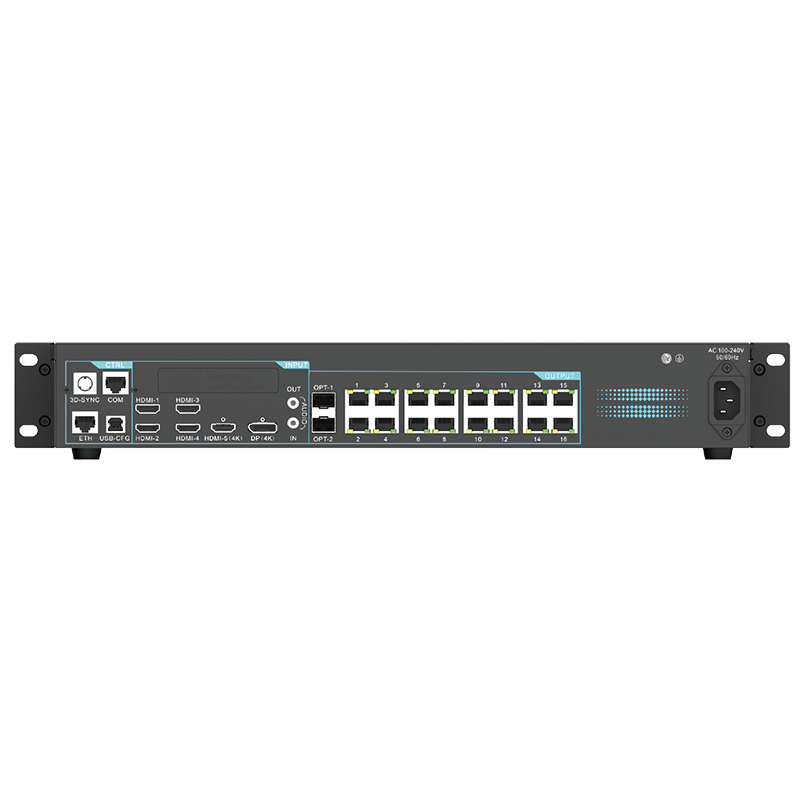 Input port : DP1.2*1, HDMI2.0*1 HDMI1.3*4, audio*1 Output port : LAN*16, audio*1,OPT*2 Control port : USB -CFG*1, COM*1,NET *1,3D *1 Load:10.4M Max width: 16360 Max height:10240