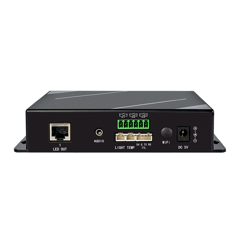 Gigabit output network port*1: output signal to receiving card Audio output port*1: 1/8″ (3.5mm) TRS plug output USB2.0*1: connect to USB flash drive, plug and play 100M input network port*1: connect to LAN, cluster control WiFi: AP+STA dual WiFi mode Reserved light sensor and temperature sensor interface,4G/GPS*1 (optional), optional 3-way relay control Load: 65W Max width: 3840 Max height: 2000
