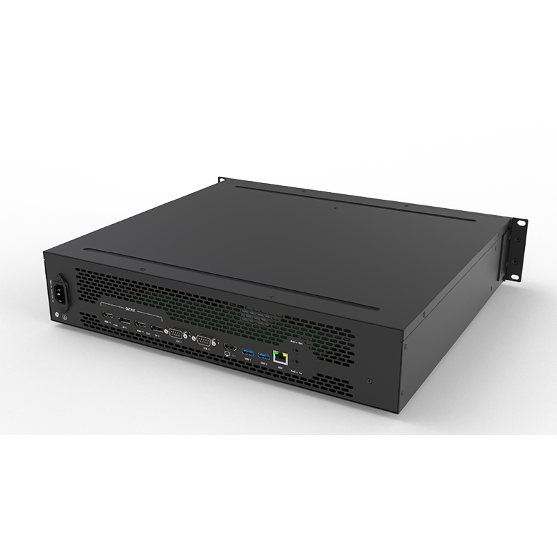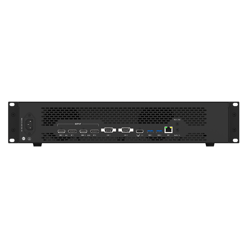 Two DP/HDMI outputs (select one of these), offering smooth, point-to-point 4K@60Hz display.One independent HDMI HD monitor output.Hardware decoding support, powerful rendering capabilities, and excellent playback performance.Multi-window scene control, allowing simultaneous playback of up to eight screens.Projection correction and fusion support, along with saved and recallable projection fusion templates.Practical tools such as subtitles, teleprompters, and countdown timers.Built-in video transcoding tools for quick conversion when video format or parameter issues arise.Simulation screen layout management, including split display ports, customizable display, and arbitrary layouts.Real-time synchronization between primary and backup outputs, seamless switching of sync signals.Automatic backup of project edits, preventing on-site re-editing.Supports NDI network screen capture.Supports PPT animation effects, internal audio and video playback, web and streaming media playback.Supports network central control and mobile cloud control systems, enabling mixed-scene audio, video, and lighting for LED/LCD/DLP displaysIntegrated control and mobile remote control (supports Android and iOS systems)Convenient functions such as pre-plan group jump, time trimming, and shortcut keysControl commands support remote command control via the UDP protocolSupports scheduled tasks for unattended operationSupports linkage control with splicers and consoles for scene switching